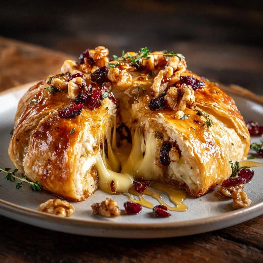 Use a vegan brie substitute and replace the egg wash with a plant‑based milk glaze. This version maintains the same flaky, golden crust while being entirely plant‑based.